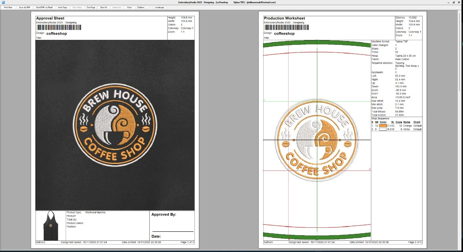 Order Details: Product preferences, sizes, embroidery/print specifications, and transaction history.
